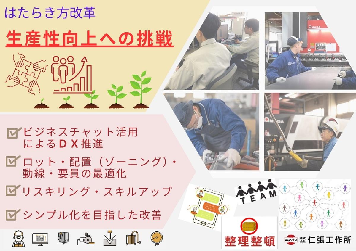 『3S活動と職場環境整備の推進』・・・毎朝の3S活動や終業時のそうじなどは、場を清め、QCD向上に直結する取り組みです。特に場所が狭い都市型町工場である仁張工作所においては、動線を意識した半製品や副資材の配置や補充のしくみづくりやその運用は、生産性向上に大きく関係すると捉えています。また、日々の3S活動だけはまかなえないインフラ整備・設備保全・美化活動などにも積極艇に取り組んでいます。そうすることで、はたらく人々や、来社いただく方々に気持ちの良い印象を与えられるよう、日々取り組んでいます。