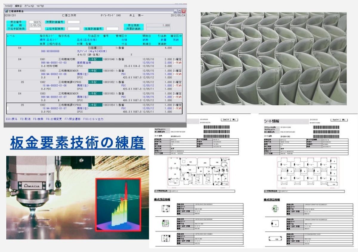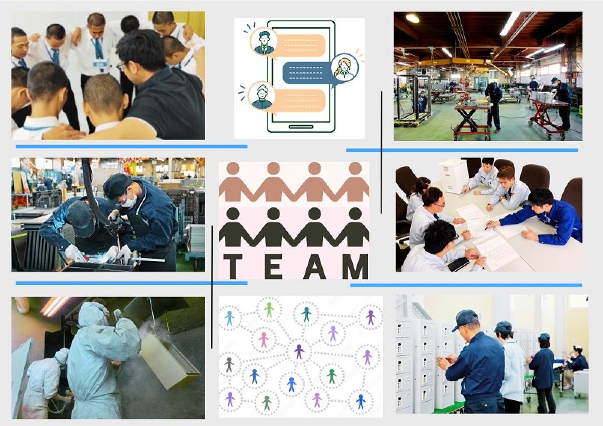 『セカンドスキル(多能工化)を育むOJT支援』・・・例えば、『機械も操作できるし溶接もできる』『塗装もできるし組立作業もできる』『生産計画も作れて商談対応もできる』といった板金加工スキルの向上について、直接部門である製造部メンバーが取り組みます。また、間接部門における事務作業においては、営業・総務・資材などセクションの垣根を低くすることで、送り状や納品書出しなどの事務処理において“手伝いあう”風土づくりに取り組んでいます。