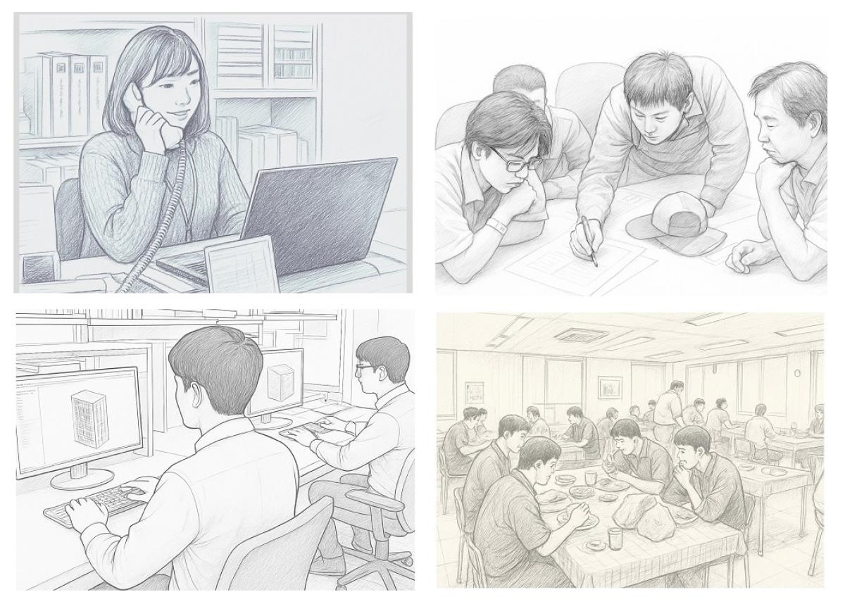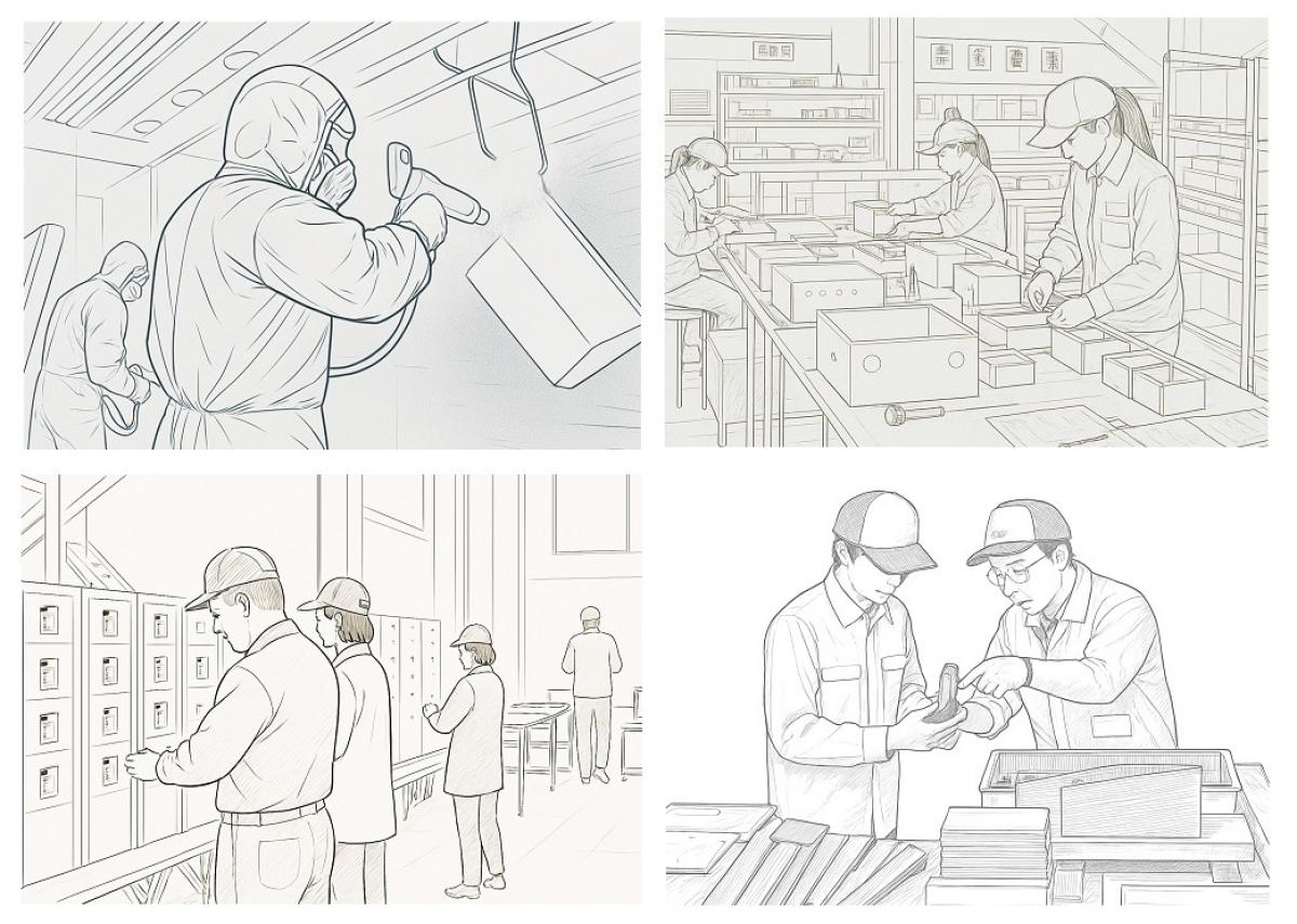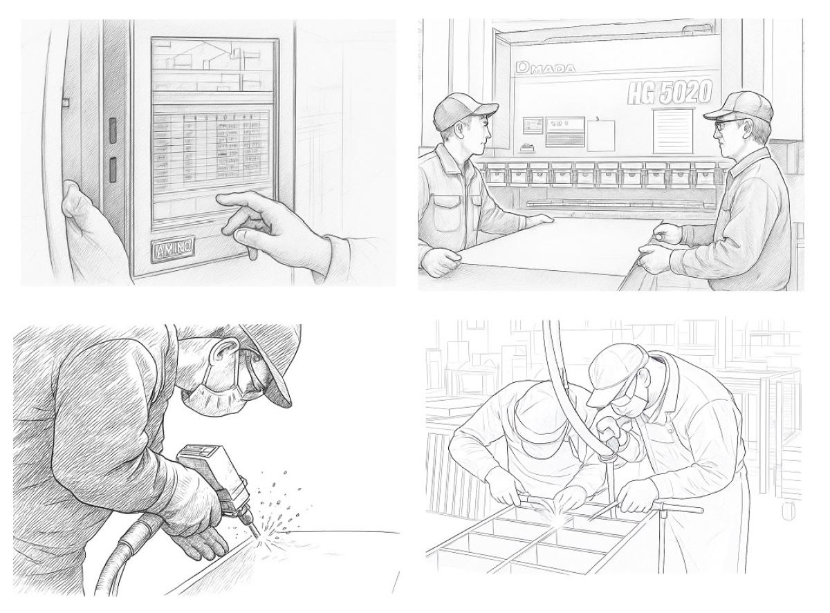 仁張工作所(にんばりこうさくしょ)の会社の様子をイラストでご紹介いたします。“ものづくりの町”東大阪市で60年以上つづく板金加工の「まち工場」として、これからもお客さまに信頼されるよう取り組んでまいります。