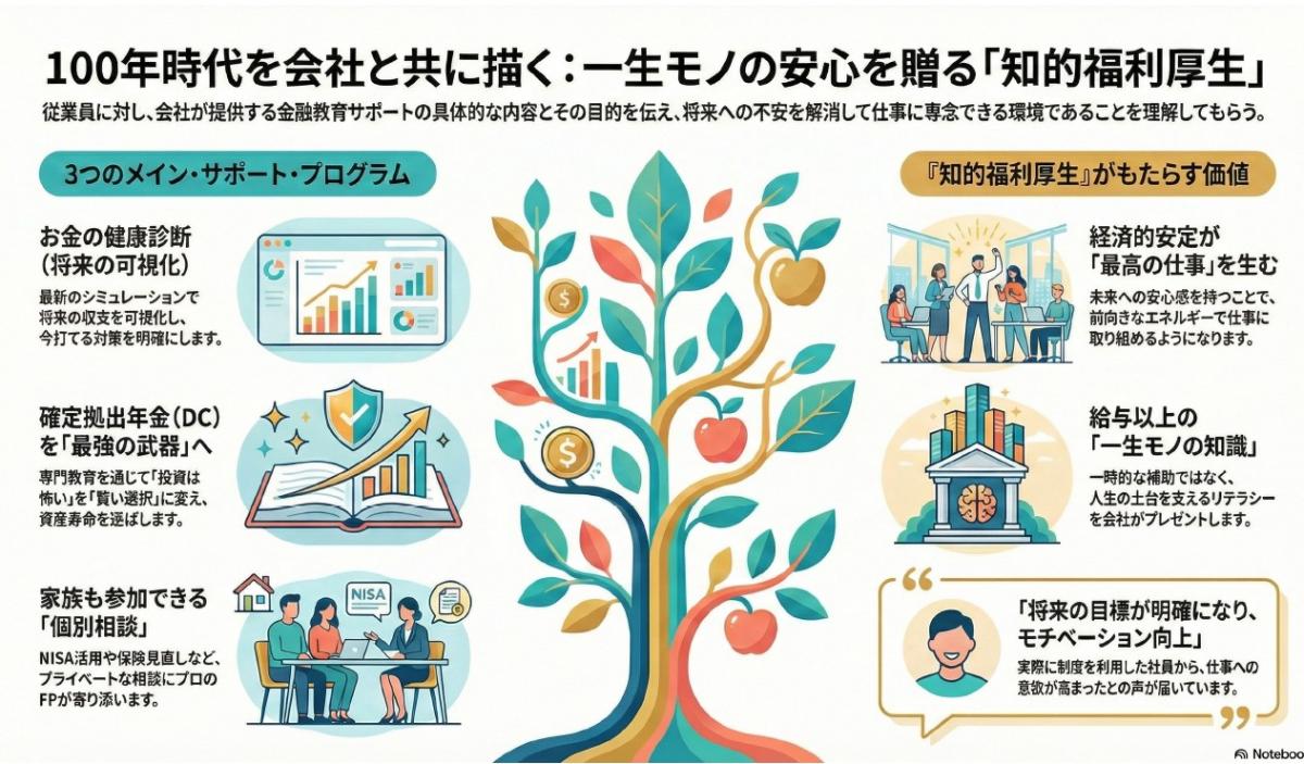 モノの割引や一時的な補助ではなく、人生の土台を支える「お金のリテラシー」を高める支援。それが独自の福利厚生制度です。