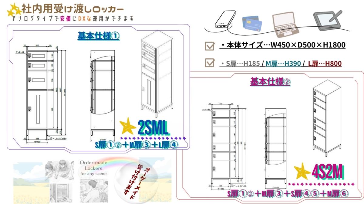 1.【受け渡しロッカー 2SML】…本体サイズ 幅450×奥行500×高さ1800、上から扉『S』『S』『M』『L』